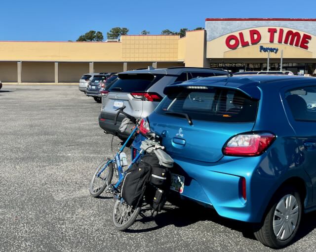 I parked in front of something called Old Time Pottery. Would anyone care if I left “my” car here for a day or two? I looked around for signs about towing, There were none here, although a quarter mile away at the Harbor Freight there were absolutely such signs. I unfolded the Bike Friday.