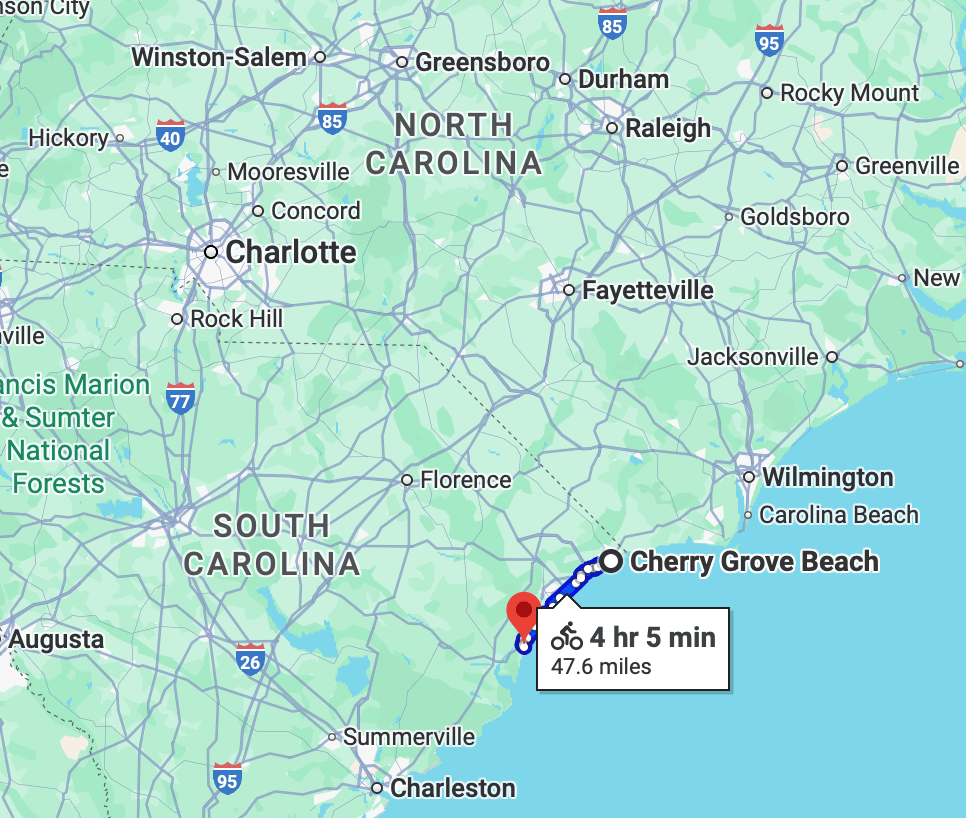 I keep coming back to cycle through beach towns particularly because some, only some, have long street grids allowing cycling for miles and miles in a straight line through almost traffic-free residential areas. I had been to Myrtle Beach SC before and it is an acquired taste. Especially away from beachside residential areas and out on the nearby big highway US-17, the “Grand Strand” is a shrine to car-centered commercial sprawl and touristy schlock.