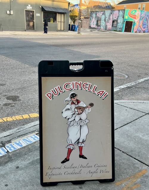 Pulcinella! sits on St. Bernard Avenue, a main commercial drag of the traditionally Creole Black Seventh Ward. Being only seven or eight blocks from the French Quarter this restaurant is a sign of the area’s gentrification.